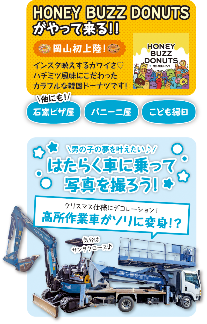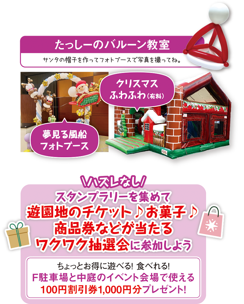 キャラクターショーをはじめ、小さいお子様向けの催しを多数予定しています。今回はクリスマス直前ということで、色々な形での「プレゼント」があるかも!?